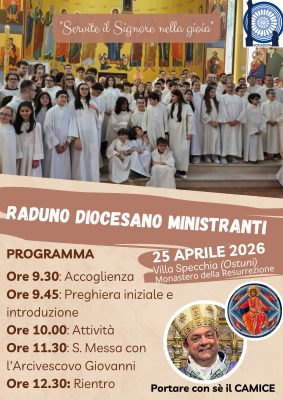 Anche quest’anno la Diocesi rinnova un appuntamento molto atteso: il raduno dei ministranti, occasione preziosa di incontro, condivisione e crescita nel servizio liturgico. Il servizio all’altare rappresenta un impegno importante e significativo per tanti ragazzi e giovani, chiamati a vivere con responsabilità e dedizione il loro ruolo nelle celebrazioni. Essere ministranti significa infatti partecipare più […]