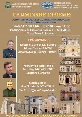 Un invito a riscoprire il valore della comunione, della condivisione e del cammino spirituale vissuto insieme. È questo il cuore dell’iniziativa dal titolo “Camminare insieme: per un rinnovato slancio della vita spirituale nei sodalizi confraternali”, che si terrà il prossimo 18 aprile a Mesagne, presso la Parrocchia San Giovanni Paolo II. L’evento nasce dal desiderio […]