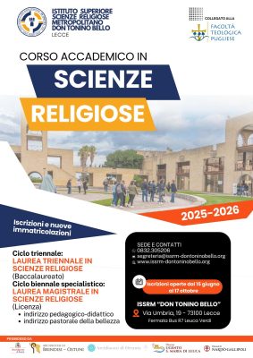 Dal 1° settembre sono aperte le iscrizioni all’Istituto Superiore di Scienze Religiose Metropolitano “Don Tonino Bello” di Lecce, in vista dell’inizio del nuovo anno accademico fissato per il 6 ottobre 2025. L’Istituto, eretto dalla Santa Sede e collegato accademicamente alla Facoltà Teologica Pugliese, è da anni un punto di riferimento per chi desidera affrontare con […]