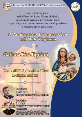 Parrocchia “S. MARIA ASSUNTA” – San Donaci (BR) Con immensa gioia, nella Festa del Santo Nome di Maria, la comunità cristiana invita tutti i fedeli a partecipare ad un momento speciale di preghiera e rendimento di grazie per il 10° Anniversario di Consacrazione nellOrdo Virginum di Galiana Rita Epifani Venerdi 12 Settembre 2025 in CHIESA […]