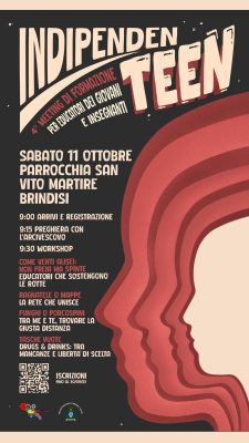 Sappiamo che stavate aspettando questo momento … ed ecco giunto puntuale anche quest’anno ”indipenTEEN” il 4° Meeting diocesano PG per tutti i formatori e insegnati degli adolescenti e giovani della nostra Arcidiocesi! Rifletteremo sul tema delle DIPENDENZE, nelle sue diverse forme, relazioni e luoghi. Ecco i temi dei quattro workshop previsti: 1. COME VENTI ALISEI: […]