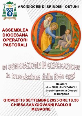 Al termine dell’Assemblea diocesana degli operatori pastorali, svoltasi a Mesagne il 18 settembre 2025, l’Arcivescovo Giovanni Intini ha consegnato alla Chiesa di Brindisi-Ostuni le nuove Linee pastorali per l’anno 2025–2026.Con il titolo “La soglia: tra il Tempio e la Strada”, il documento invita le comunità a vivere la fede come Chiesa accogliente e missionaria, capace […]