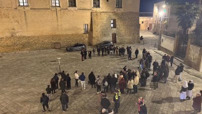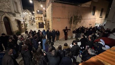 La serata è stata divisa in due parti. Nella prima parte si è vissuto un momento di pellegrinaggio nei luoghi “bui” del centro storico, non solo per esprimere fede, ma per lasciare un segno concreto nei luoghi quotidiani dei ragazzi. Durante le tre soste che sono state effettuate sono stati consegnati ai luoghi dei messaggi di speranza e dei vasetti “illuminanti” per portare luce e speranza nel buio. Il percorso ha toccato anche aree simboliche per i più giovani, spazi di aggregazione dove, come evidenziato dagli organizzatori, emergono spesso fragilità, solitudini e perfino segnali di sofferenza sociale. Tali realtà, presenti nel tessuto urbano e giovanile, costituiscono una ferita che la comunità ha voluto riconoscere pubblicamente e accompagnare con vicinanza e attenzione, ricordandoci che nessuno di noi cammina mai nel buio da solo.
